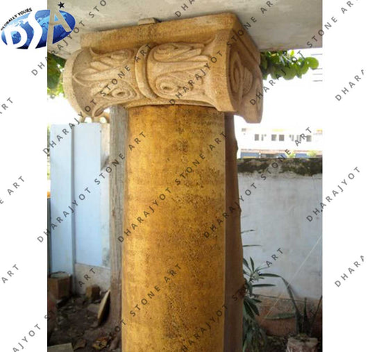 Hand Carved Round Yellow Sandstone Pedestal Garden Pillar
