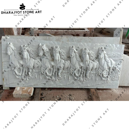 Home Décor Handcrafted White Marble Seven Horses Wall Panel