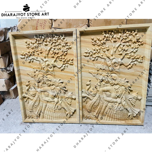 Hand-Carved Natural Sandstone Radha Krishna Wall Mural