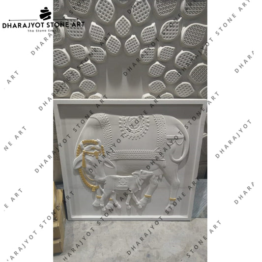 Natural White Marble Polished Antique Cow With Calf Wall Mural