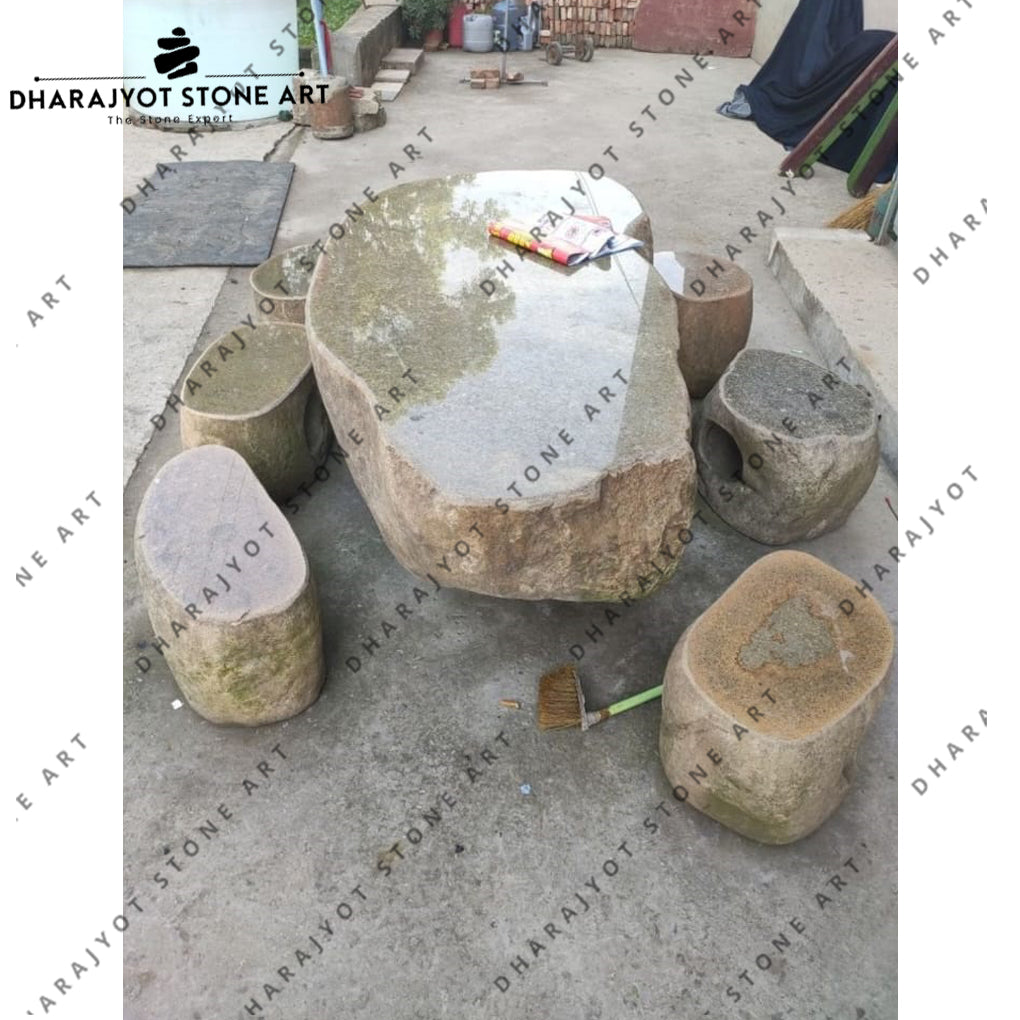 Hand-Carved Boulder Rustic Natural Stone Benches Set